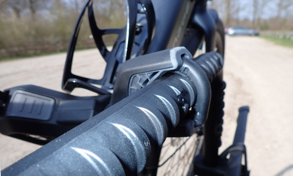 Voorheen was dit een gladde baan waar je de armen op vastzette. Bij de nieuwe, geribbelde, framebeugel zit er om de paar cm een verdikking. Tussen deze verdikkingen klem je de arm vast. Op de kop van de arm die naar het fietsframe loopt zit ook een grijze knop. Hiermee kun je de arm ontkoppelen om deze op een ander punt te zetten. Op het moment dat het ratelsysteem geactiveerd wordt blokkeert deze knop en zit het veilig vast. Zo kan de arm dus niet ineens losschieten met alle gevolgen van dien.