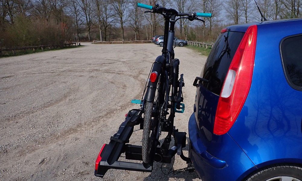 Thuis aangekomen klikken we de riempjes los, halen de fiets van de drager en klappen we de grote beugel van de drager in. Hierna los van de wagen en in de berging. Klaar voor de volgende tocht.