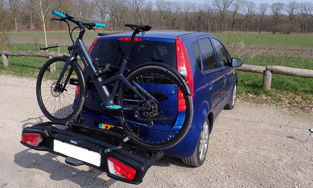 Wij hebben hier geen last van want meestal zijn we maar met zijn 2 of rijden we solo op de bestemming af. De bike die vandaag achterop staat is toevallig net zo zwaar als de fietsendrager. Ook net onder de 19 kg. Voor de zwaar uitgebouwde Thule is dat natuurlijk een eitje. Maar ook voor 2 zware elektrische trekkingfietsen draait de drager zijn hand niet om.