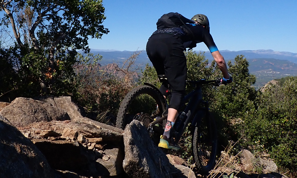 In de week voor het evenement rijden we dan lekker door het achterland over paden als Ceinturion, waar we Esterel, Cap Lourde en Mont Vinaigre in een lijn langs ons zien gaan. Schitterende uitzichten met de lage najaarszon. Over paden als Les Adrets de Esterel vliegen de stenen en drops je om je oren. Alles messcherp en je vraagt je af hoe je banden het uit zullen houden op de stenen. Gelukkig hebben we onze Neuron uitgerust met dikke Pirelli M banden welke wel meer dan een stootje kunnen hebben en scherpe stenen dan ook niet schuwen. 2 weken rammen en stuiteren zonder lek of snakebite wil hier ook wel wat zeggen.