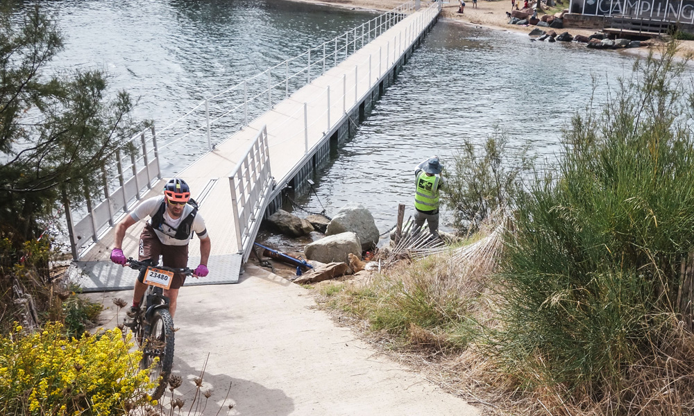 De laatste afdaling over stenen en wortels en we staan alweer aan het strand. De smokkelaarsroute is dit jaar eruit gehaald en via de pontons steken we het water over. De laatste oversteek over de Argens en we zijn alweer bijna bij de finish.