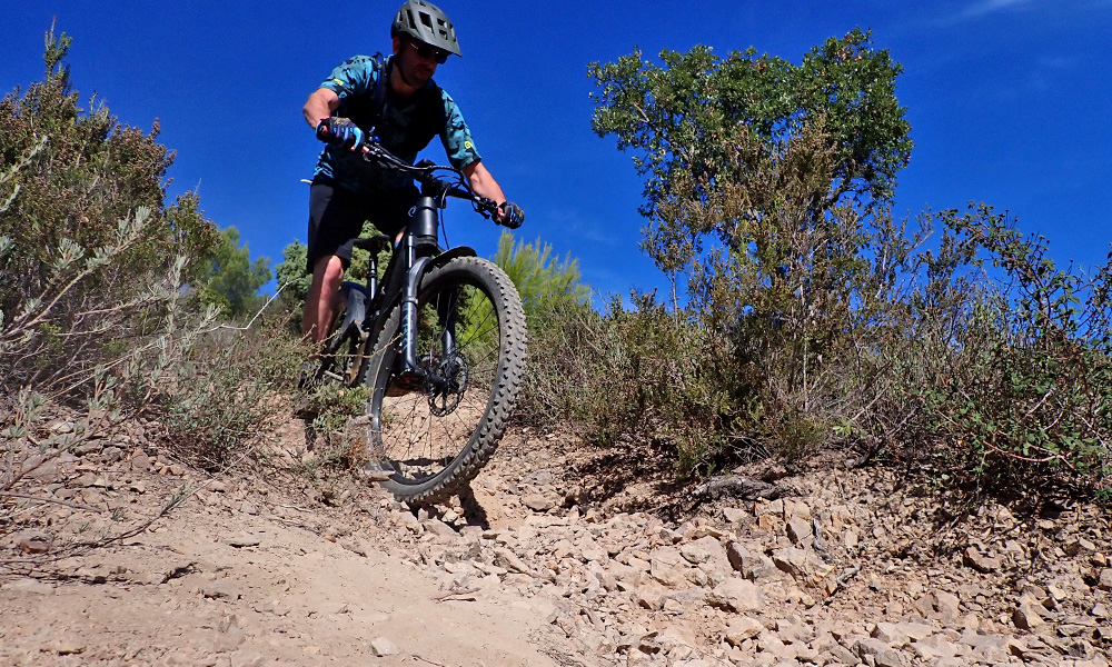 In de week voor het evenement rijden we dan lekker door het achterland over paden als Ceinturion, waar we Esterel, Cap Lourde en Mont Vinaigre in een lijn langs ons zien gaan. Schitterende uitzichten met de lage najaarszon. Over paden als Les Adrets de Esterel vliegen de stenen en drops je om je oren. Alles messcherp en je vraagt je af hoe je banden het uit zullen houden op de stenen. Gelukkig hebben we onze Neuron uitgerust met dikke Pirelli M banden welke wel meer dan een stootje kunnen hebben en scherpe stenen dan ook niet schuwen. 2 weken rammen en stuiteren zonder lek of snakebite wil hier ook wel wat zeggen.